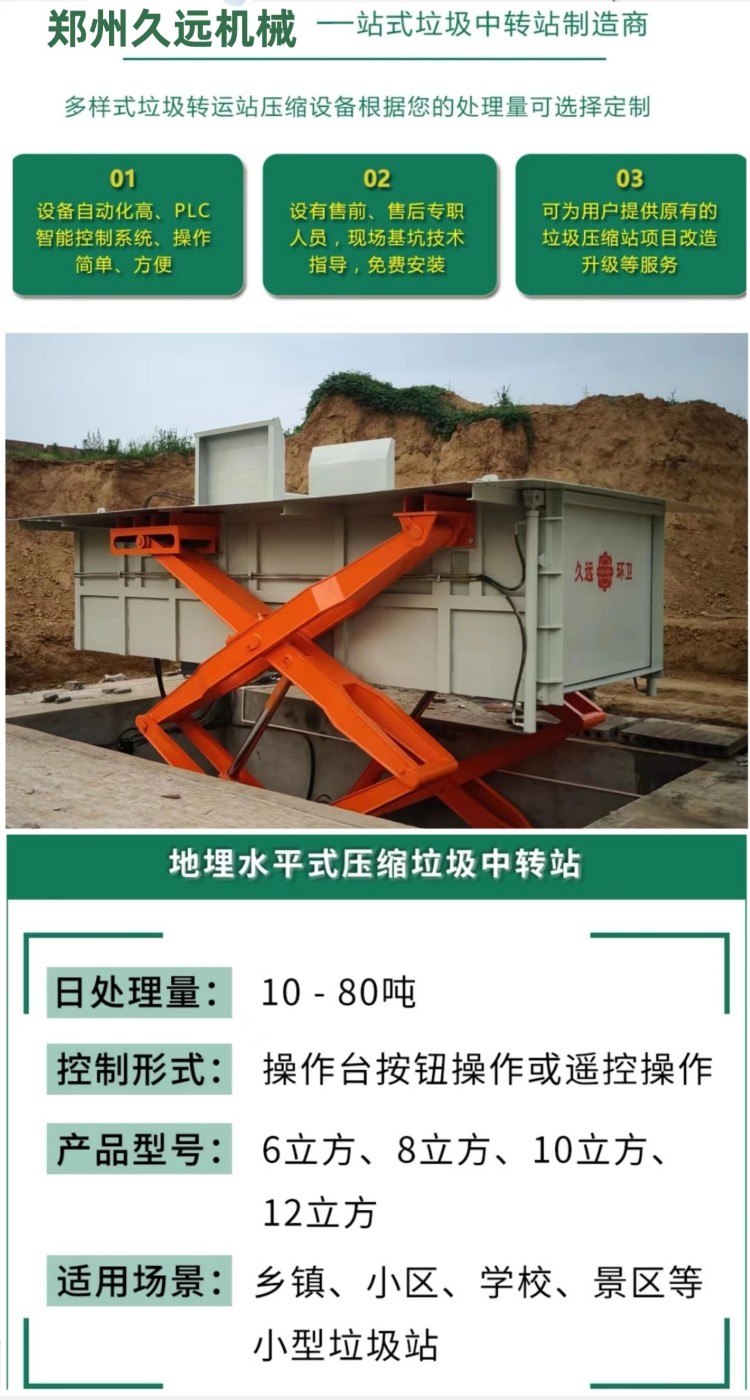 水平式生活垃圾壓縮中轉(zhuǎn)設(shè)備是將垃圾的卸(出)料、壓縮、儲(chǔ)存集合在一起,整體落于地下,利用地下空間將垃圾密閉在箱體內(nèi),地面上無(wú)垃圾外露現(xiàn)象,壓縮垃圾產(chǎn)生的污水經(jīng)排污管道直接流入污水井內(nèi),然后由污水泵排到城市污水管網(wǎng),徹底解決了垃圾在收集、儲(chǔ)存、裝運(yùn)過(guò)程中的污染環(huán)境、作業(yè)效率低等問(wèn)題。