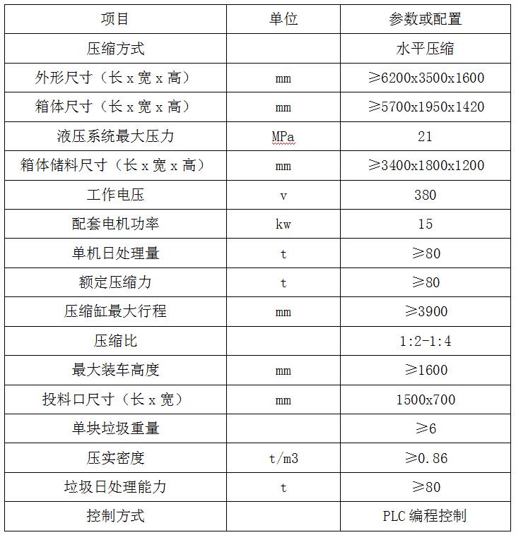全封閉水平壓縮:采用水平壓縮方式,垃圾壓縮密度≥0.86t/m3,垃圾壓縮后體積大大減小,從而大幅度提高轉(zhuǎn)運車輛裝載量和轉(zhuǎn)運效率,降低垃圾處理、轉(zhuǎn)運等費用;